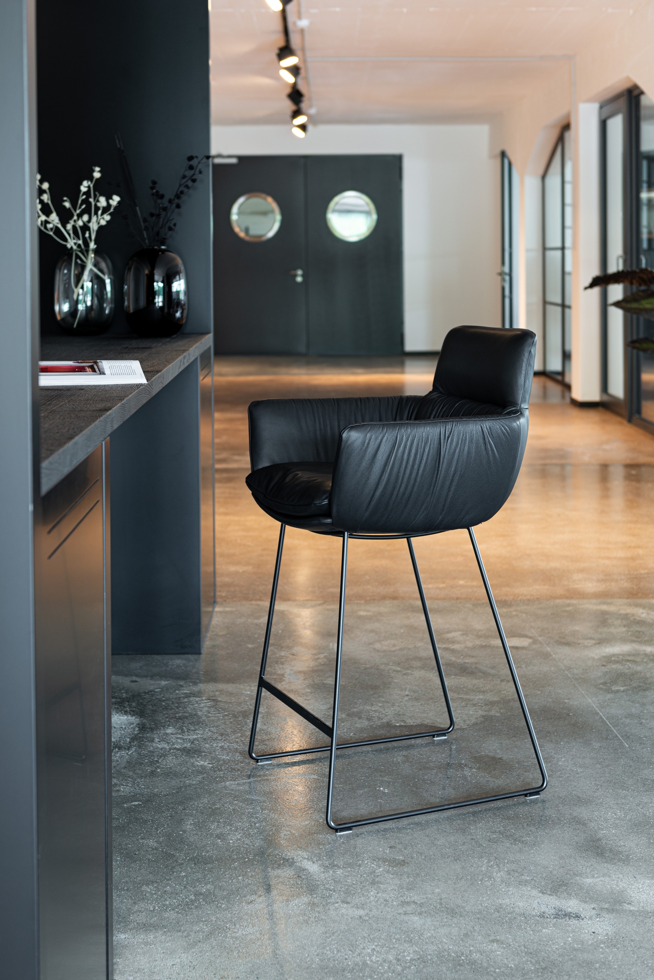 Der Barhocker ist mit einer feinen Polsterung ausgestattet, die höchsten Sitzkomfort auch bei längerer Nutzung gewährleistet. Das Drahtkufengestell aus Metall in strukturierter Anthrazit-Optik sorgt für Stabilität bei gleichzeitig leichter Anmutung. Die Kombination aus hochwertigen Leder- und Stoffbezügen schafft eine elegante, wohnliche Ausstrahlung, die sich nahtlos in moderne Einrichtungsstile einfügt.