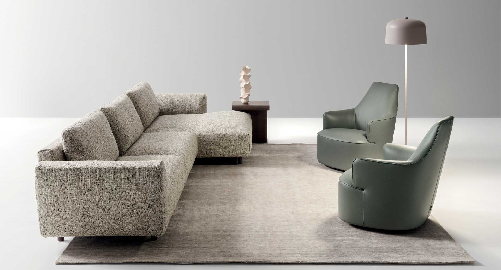 Atlantis ist als flexibles Sofasystem konzipiert. Dadurch lassen sich unterschiedliche Grundrisse perfekt möblieren – ob klassischer Zweisitzer, großzügige Sofalandschaft, Ecklösung oder Kombination mit offenen Elementen. Die einzelnen Sofateile sind so aufgebaut, dass sie ein ruhiges Gesamtbild ergeben und dennoch viel Sitzfläche bieten. Dadurch entsteht ein Sofa, das sowohl für repräsentative Wohnbereiche als auch für den täglichen Gebrauch geeignet ist.