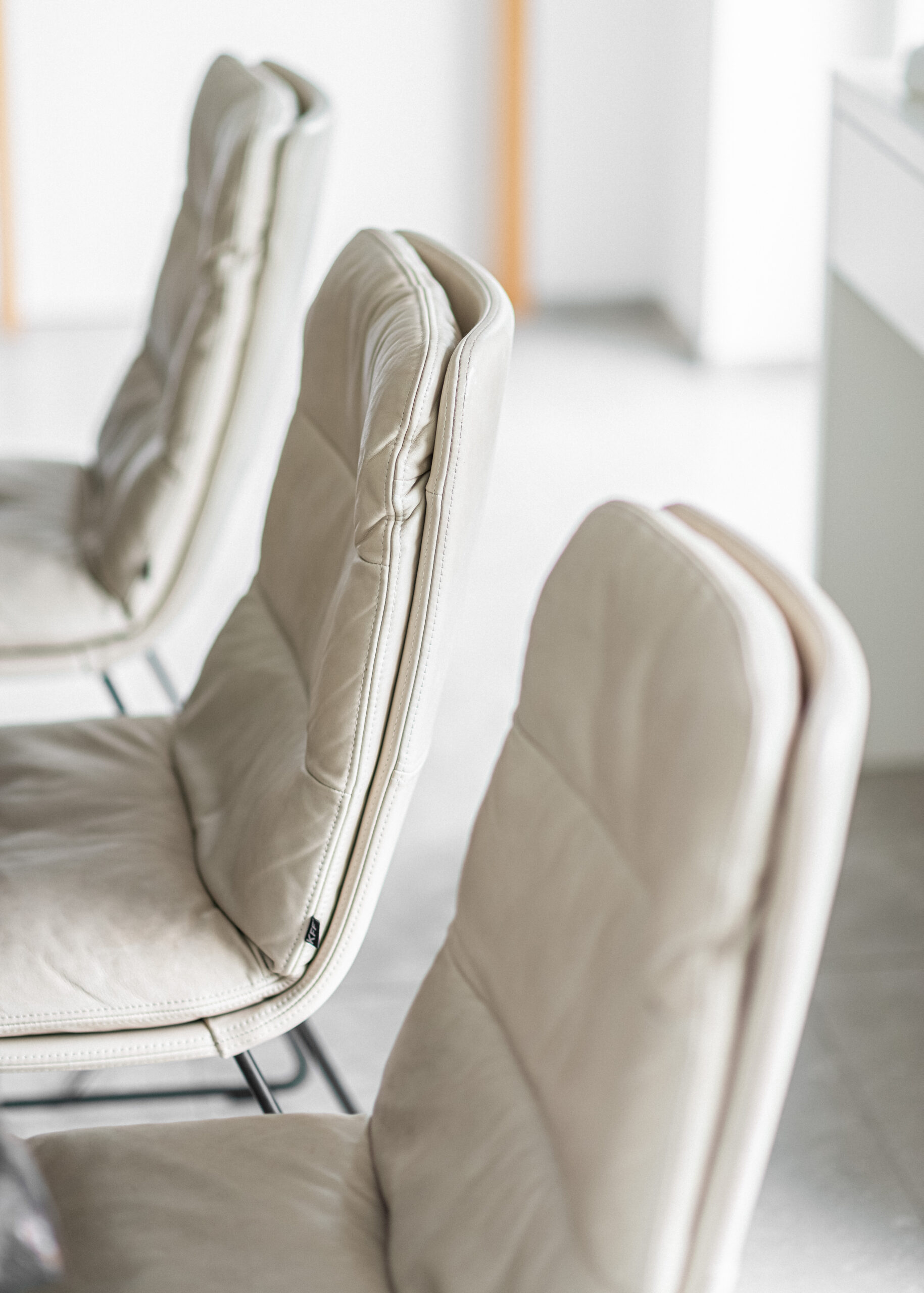 Bei der Materialauswahl setzt KFF auf höchste Qualität und Vielfalt. Die Schichtholzschale kann mit verschiedenen Premium-Ledern wie Sauvage, Siena oder Vintage sowie hochwertigen Stoffen der Kollektionen Ascot, Opera oder Lisboa bezogen werden. Besonders raffiniert ist die Möglichkeit, Schale und Kissen in unterschiedlichen Materialien zu gestalten, wodurch spannende Kontraste entstehen. Die Gestelle sind in zahlreichen Oberflächen erhältlich – von klassischem Schwarz über strukturierte Oberflächen bis zu warmen Tönen wie Macadamia oder edlem Messing.