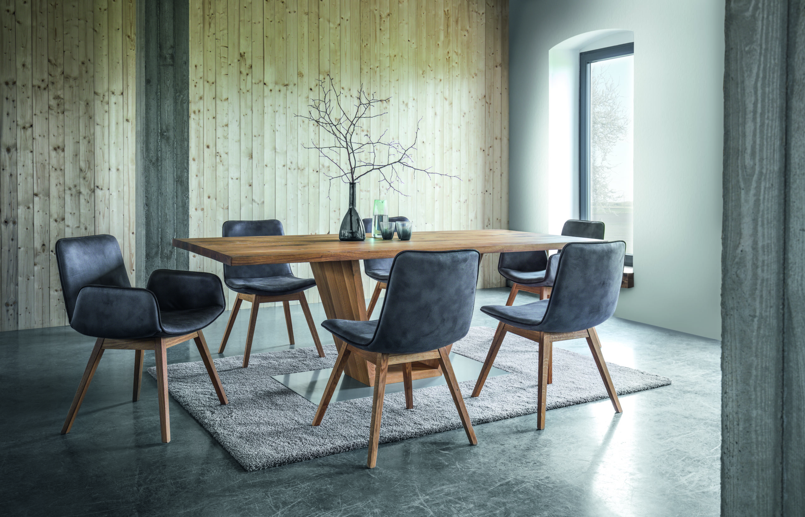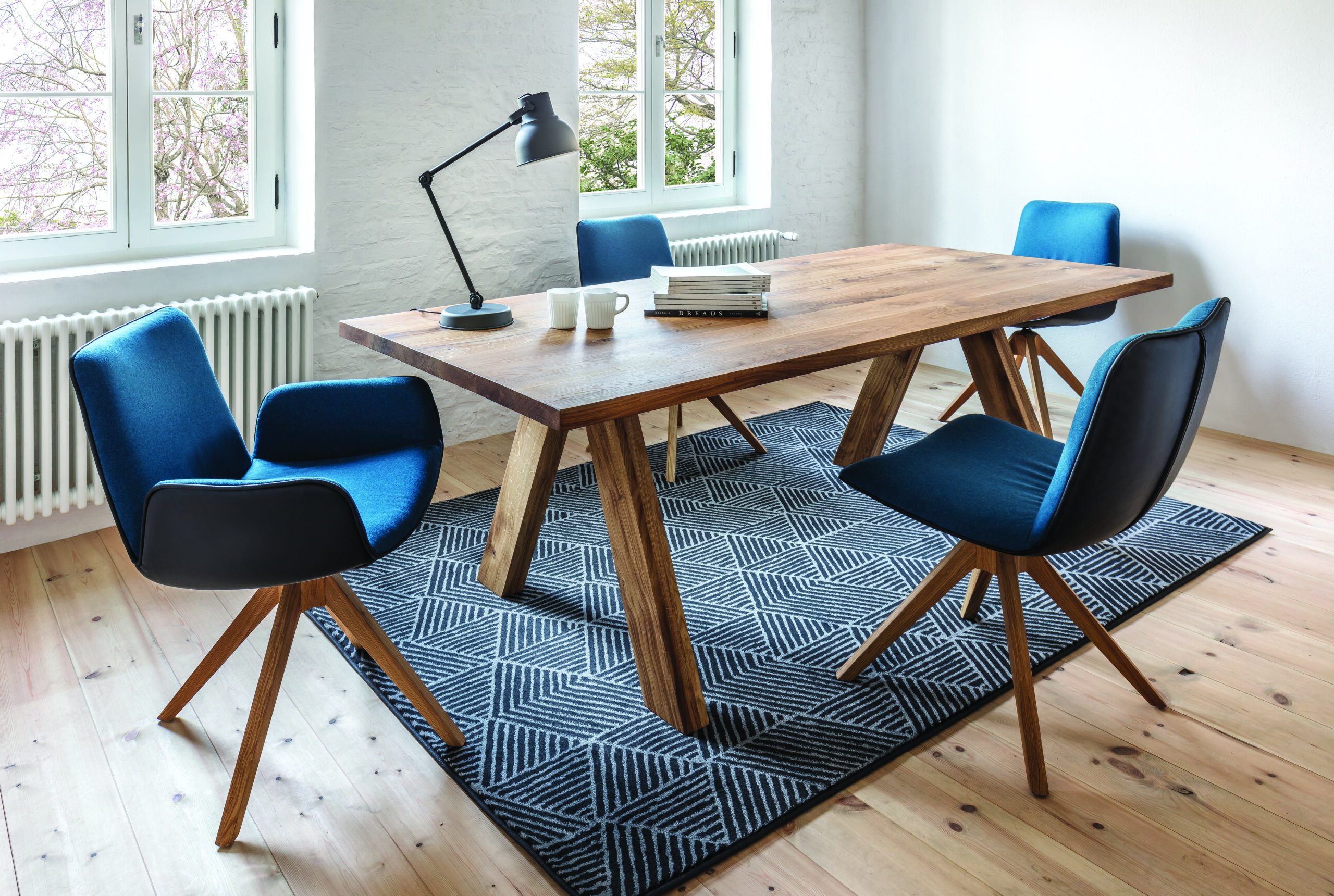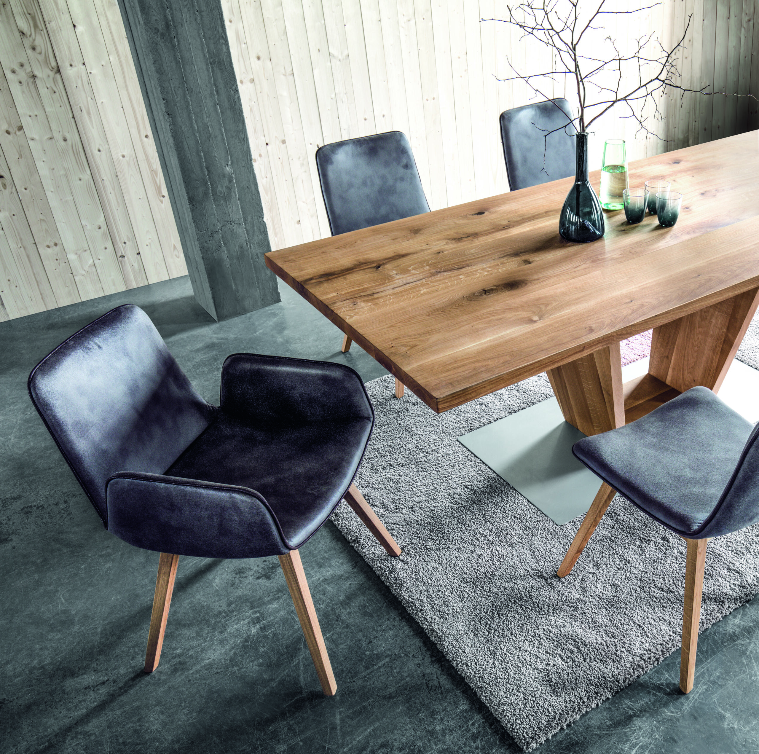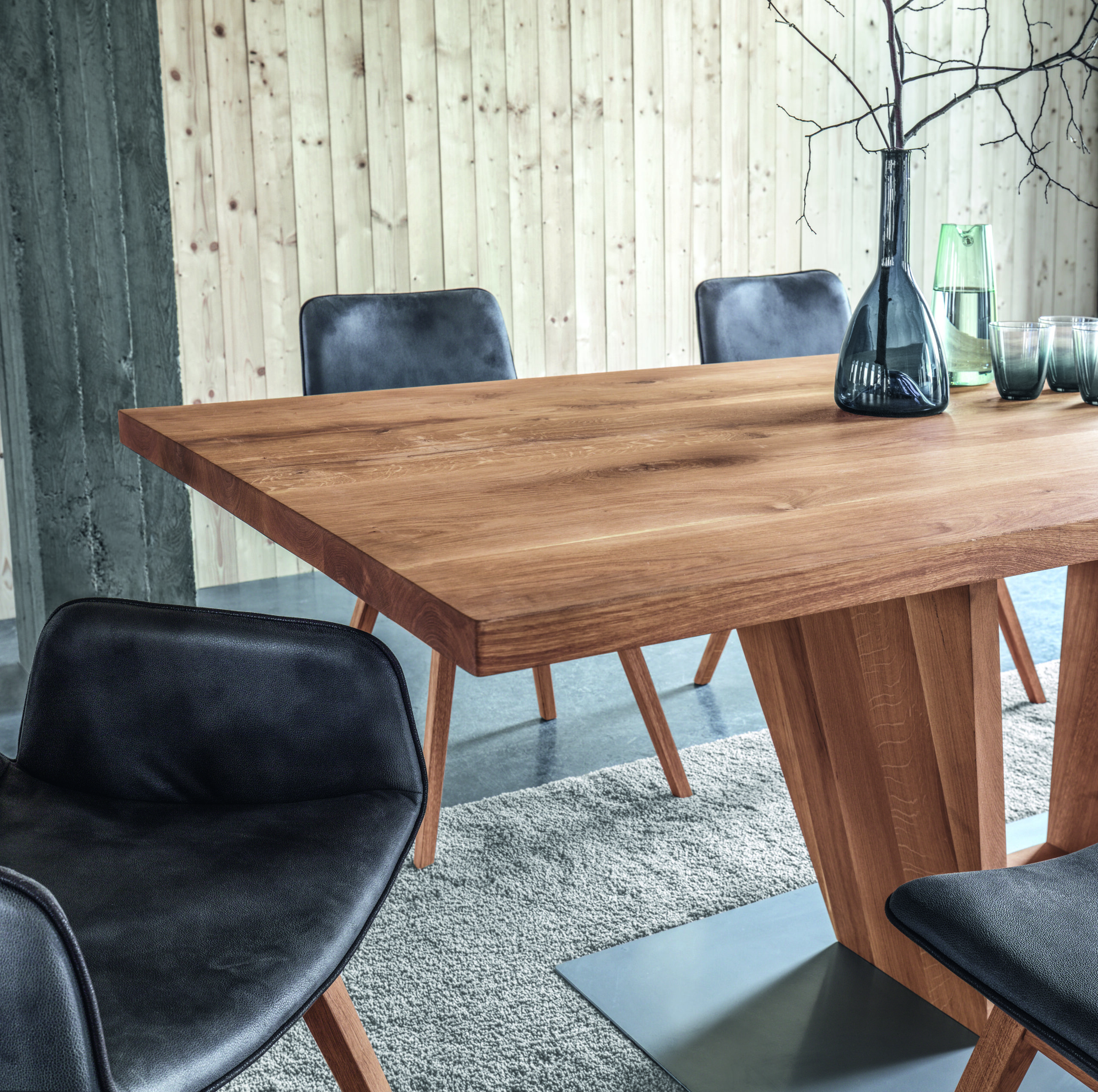 Natürliche Holzbeine: 4-Fuß-Variante oder Spinnengestell in Massivholz (Eiche, Kernbuche oder edler Nussbaum).