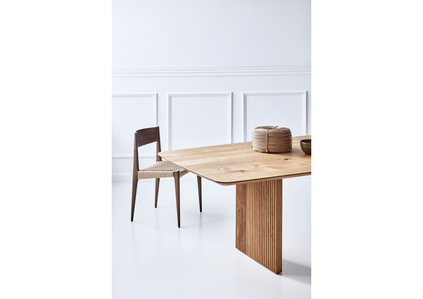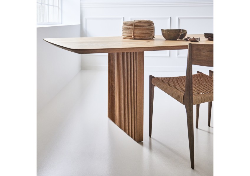 Der Ten Table von DK3 beeindruckt mit seiner schlichten, aber dennoch eleganten Formgebung. Der Tisch besteht aus einer massiven Tischplatte aus hochwertigem Holz, die auf einem soliden Gestell aus Edelstahl ruht. Die Kombination aus Holz und Edelstahl verleiht dem Tisch eine zeitlose Ästhetik, die sich nahtlos in jeden Raum einfügt.