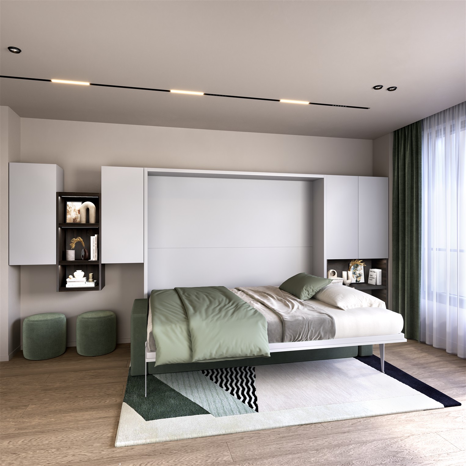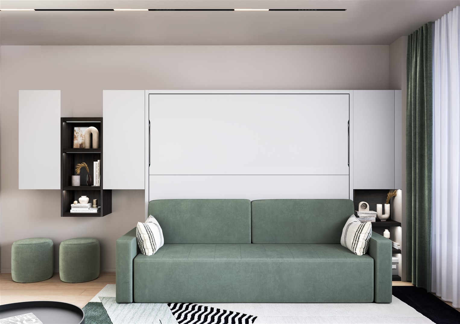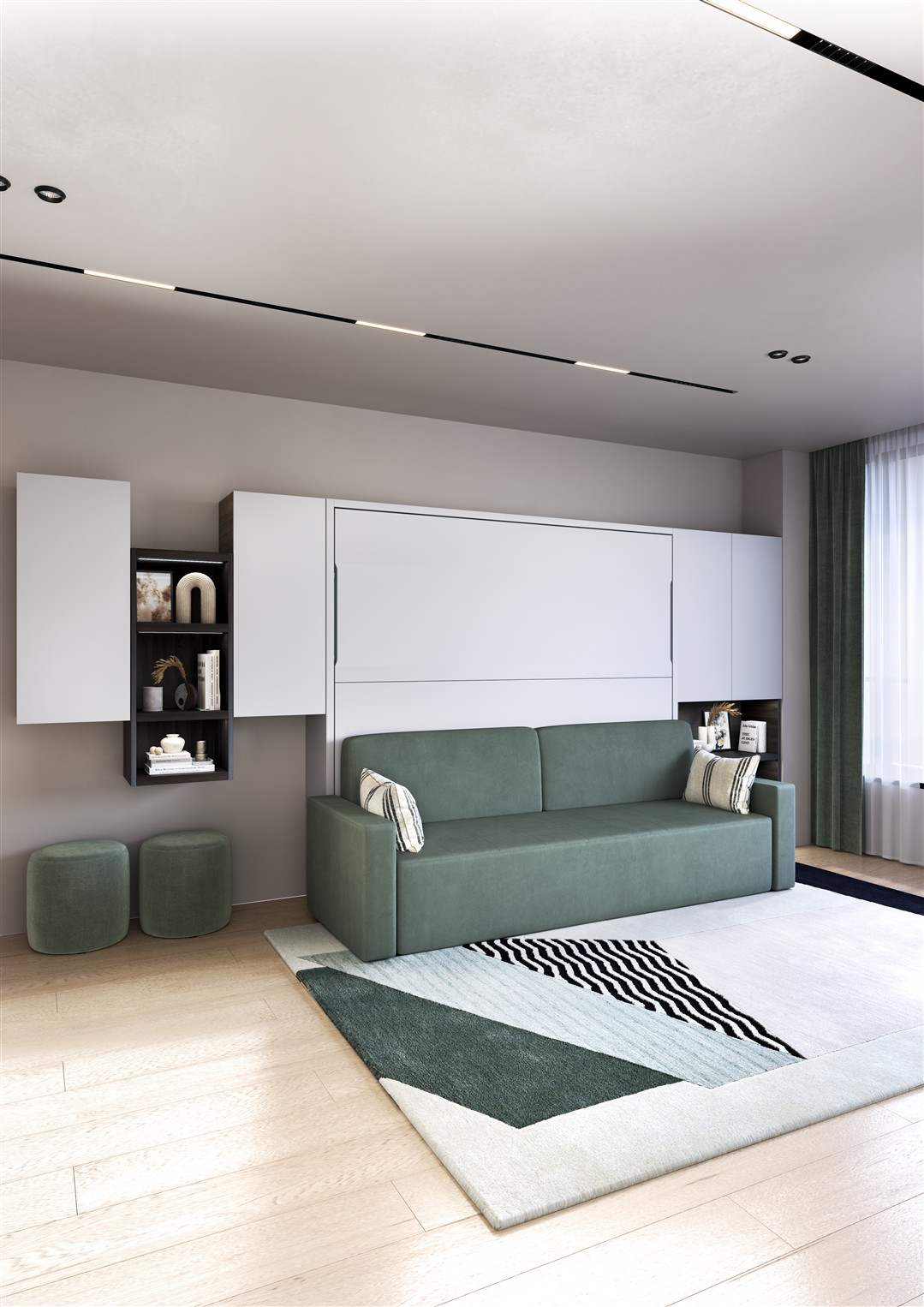 - Wohnzimmer / Homeoffice: Arbeiten am Tag, Wandbett für die Nacht – ein Möbel, zwei Funktionen.