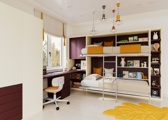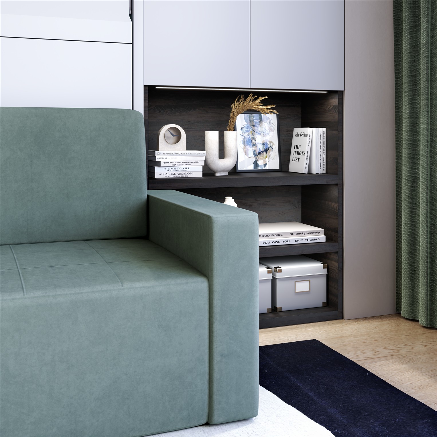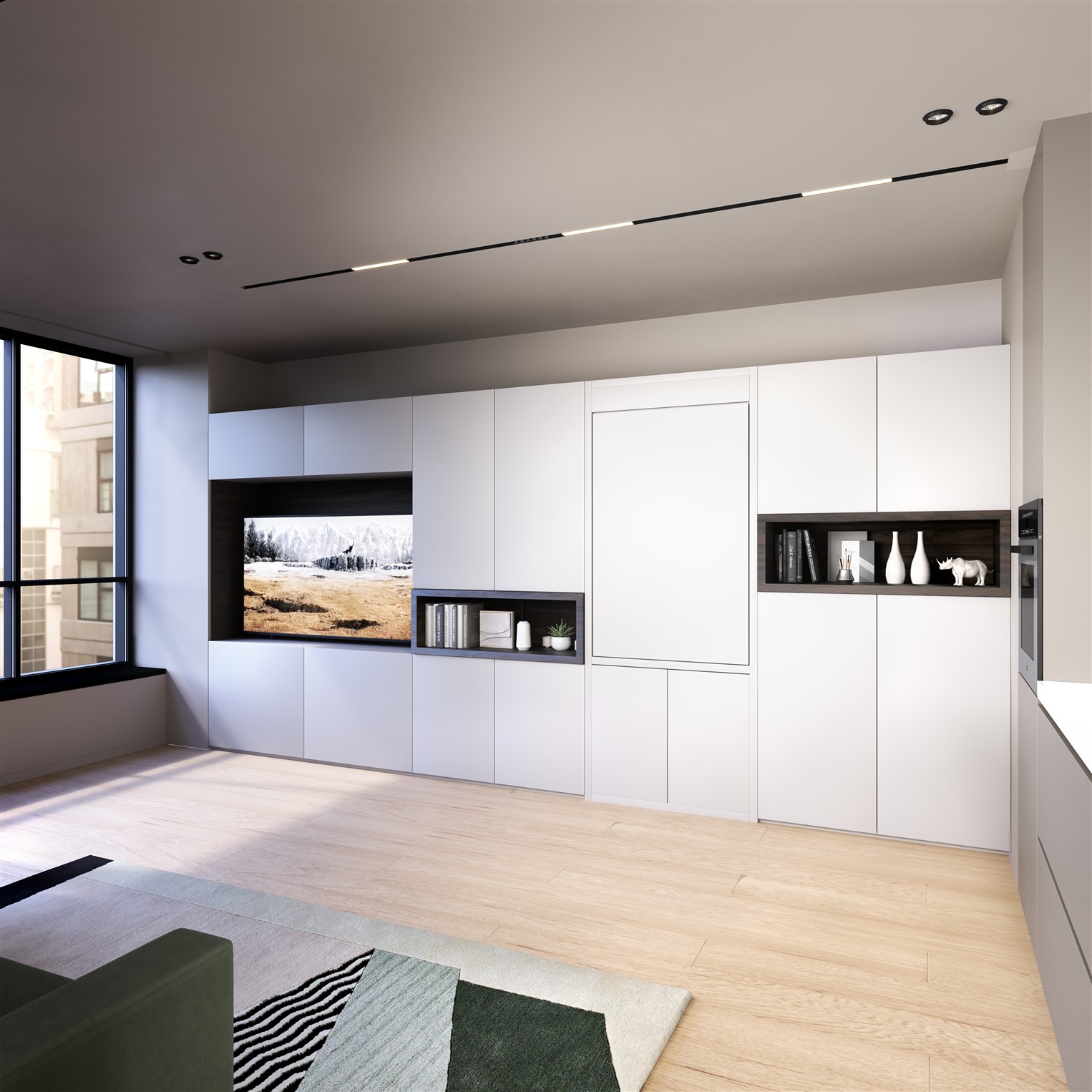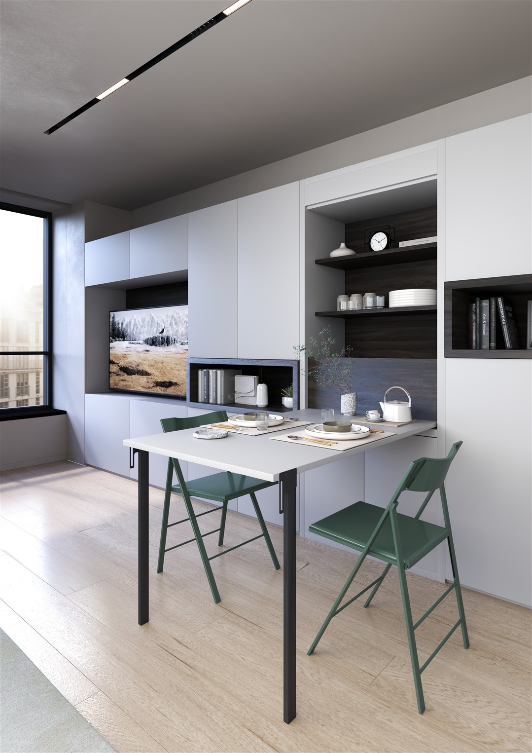 - Wohnzimmer / Homeoffice: Arbeiten am Tag, Wandbett für die Nacht – ein Möbel, zwei Funktionen.