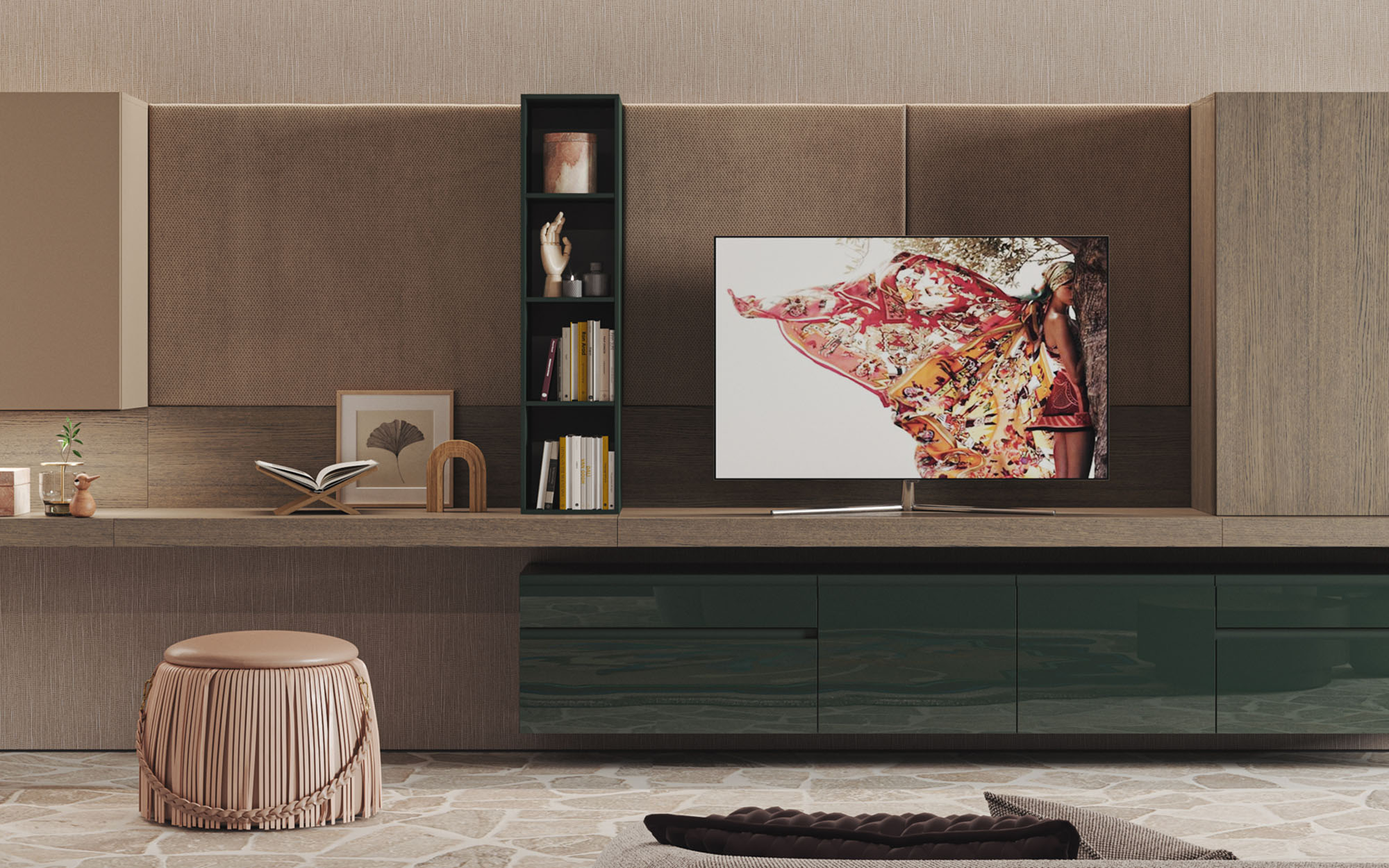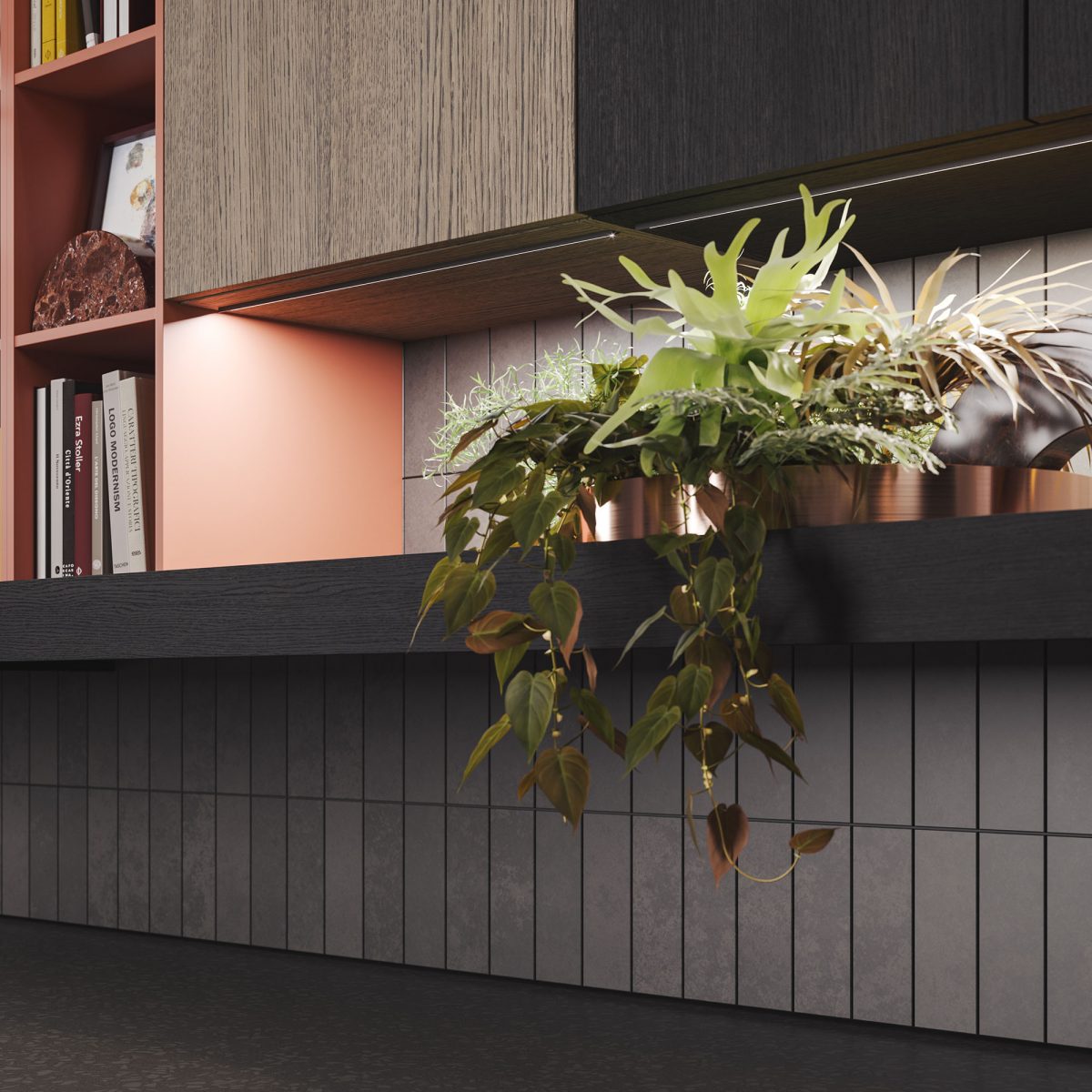 Ästhetische Ordnung: Durchdachte Stauraumlösungen lassen technische Geräte und Alltagsgegenstände unsichtbar verschwinden, während Dekorationsobjekte stilvoll in Szene gesetzt werden.