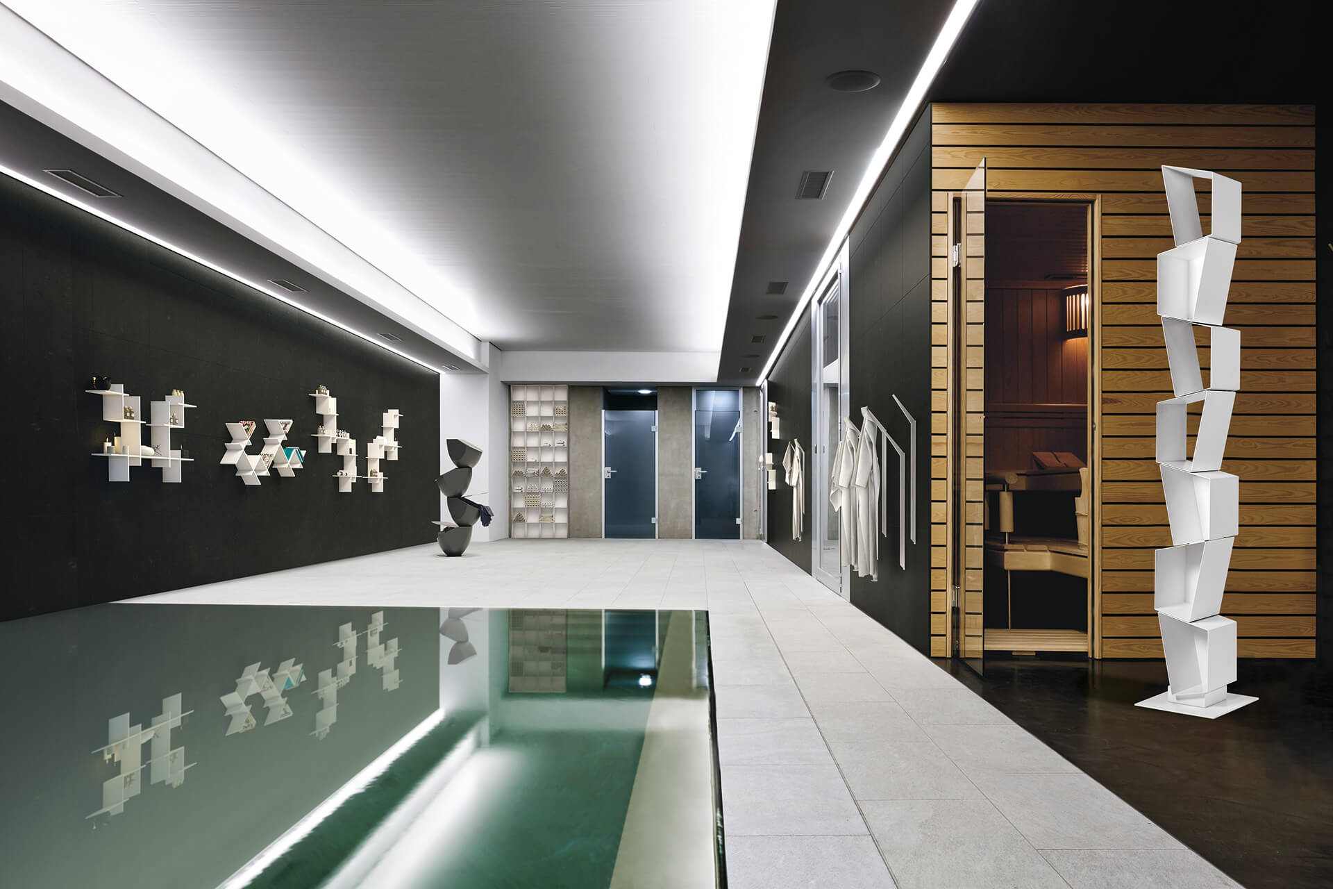 Magnetica ist als modulares System konzipiert. Unterschiedliche Elemente können frei kombiniert werden, um individuelle Lösungen zu schaffen – von minimalistischen Wandgestaltungen bis hin zu komplexen Wohnwänden mit Stauraum und Präsentationsflächen.